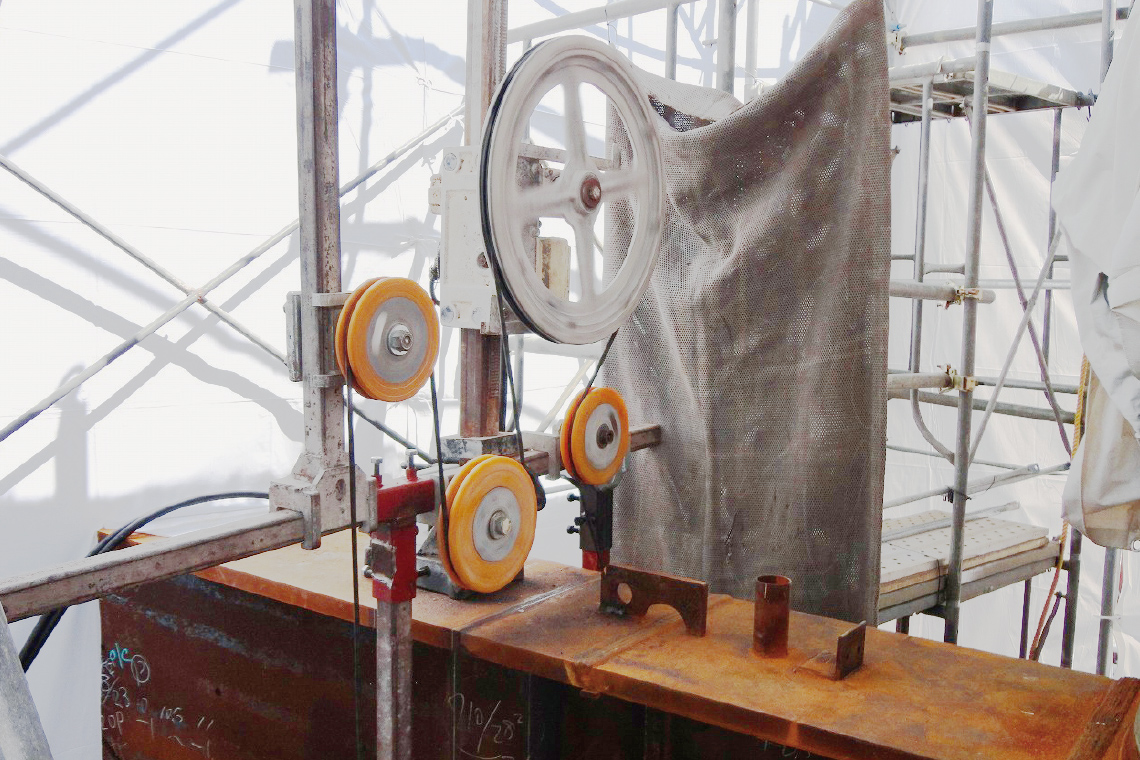ダイヤモンドチップを一定の間隔で焼結させたワイヤーを切断対象物に巻き、張力をかけながら高速回転させることで対象物を切断する工法。ワイヤーを通すことができれば、複雑な形状物や狭い場所、大断面など対象物の制限なく切断が可能です。